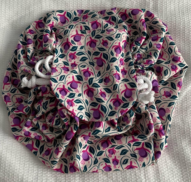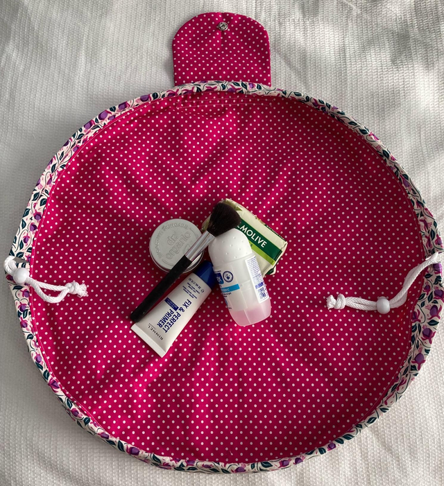 Circular drawstring cosmetic bag in a fuchsia outer and a cerise polka dot inner. It has a contrasting white cord.