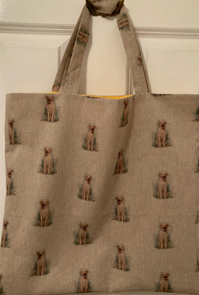 Golden Labrador themed shopper in a linen fabric. It features a large Golden Labrador the front and mini Golden Labradors on the back. It is lined in a bright marigold yellow coloured poly cotton.